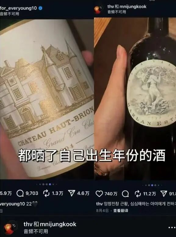 04年出生的张元英晒了04年的红酒,95年出生的金泰亨也晒了95年的红酒,且两人一前一后,都是在8月晒出来的。