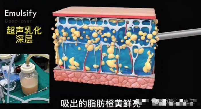 超声吸脂,是先用超声将想要清除的脂肪震碎成小颗粒乳糜状,优势是比负压吸脂用的吸脂管更细,创口更小,更适合精雕。