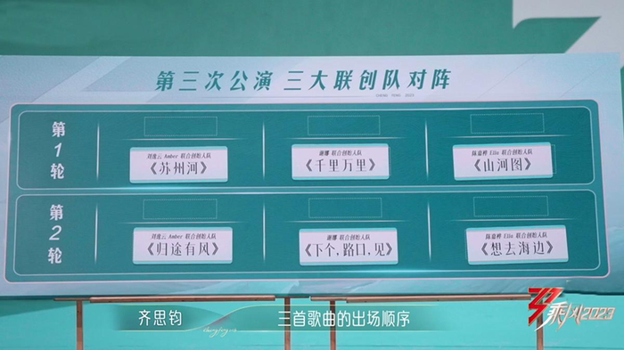 第三轮为联创队队长合作赛,3位队长同台合作完成一首歌曲,1000位观众选择1位队长进行投票。3位队长的个人票数将计入联队总成绩,总成绩第一的联创队全员安全,其他两支联创队根据个人喜爱度排名产生2个淘汰名额。