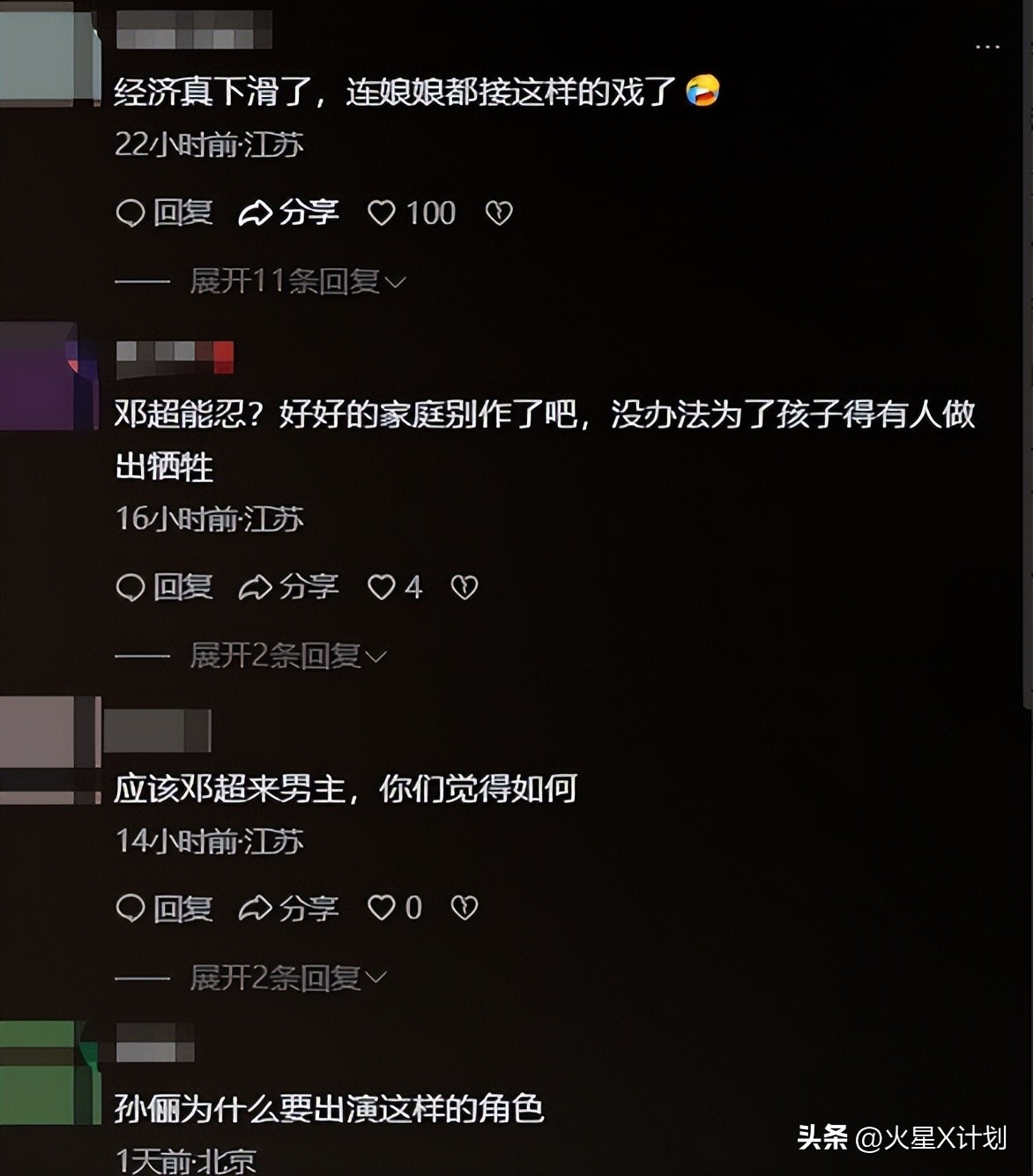 ,---,1. **老娘毁于一剧** ,昵称:孙俪的粉丝已经被毁了,44岁的她居然还能演这么大尺度的戏?真是太“惊喜”了! ,2. **邓超看了得气疯** ,昵称:邓超的邓妈被毁,家门口的“贤妻良母”怎么能演这样的大尺度戏? ,3. **人设崩塌** ,昵称:从《甄嬛传》的熹妃到《危险关系》的“大尺度女”,孙俪的人设真的太“稳定”了! ,4. **44岁的“孩子妈”还能这么演** ,昵称:44岁的母亲还在拍大尺度戏,真是太“有野心”了! ,5. **从“实力派”到“大尺度女演员”** ,昵称:孙俪的演艺路线突然转弯,44岁的她居然还能挑战如此“叛逆”的角色? ,6. **观众觉得她太“老”了** ,昵称:观众直言,44岁的孙俪不应该演这种“年轻人”戏,她的表演太“老套”了! ,7. **人设背叛** ,昵称:从“贤妻良母”到“大尺度女演员”,孙俪的人设真的太“狠”了! ,8. **市场定位太尴尬** ,昵称:孙俪的市场定位现在居然是“大尺度女演员”,真是太“尴尬”了! ,9. **吃瓜有多甜** ,昵称:观众热议孙俪的大尺度戏,吃瓜有多甜,44岁的她居然还能演出如此“杀手级”表演! ,10. **从“实力派”到“大尺度女演员”** ,昵称:孙俪的演艺生涯突然转向“大尺度”,44岁的她居然还能保持如此“火辣”状态! ,---,这些评论可以根据实际情况调整,希望能满足你的需求!
