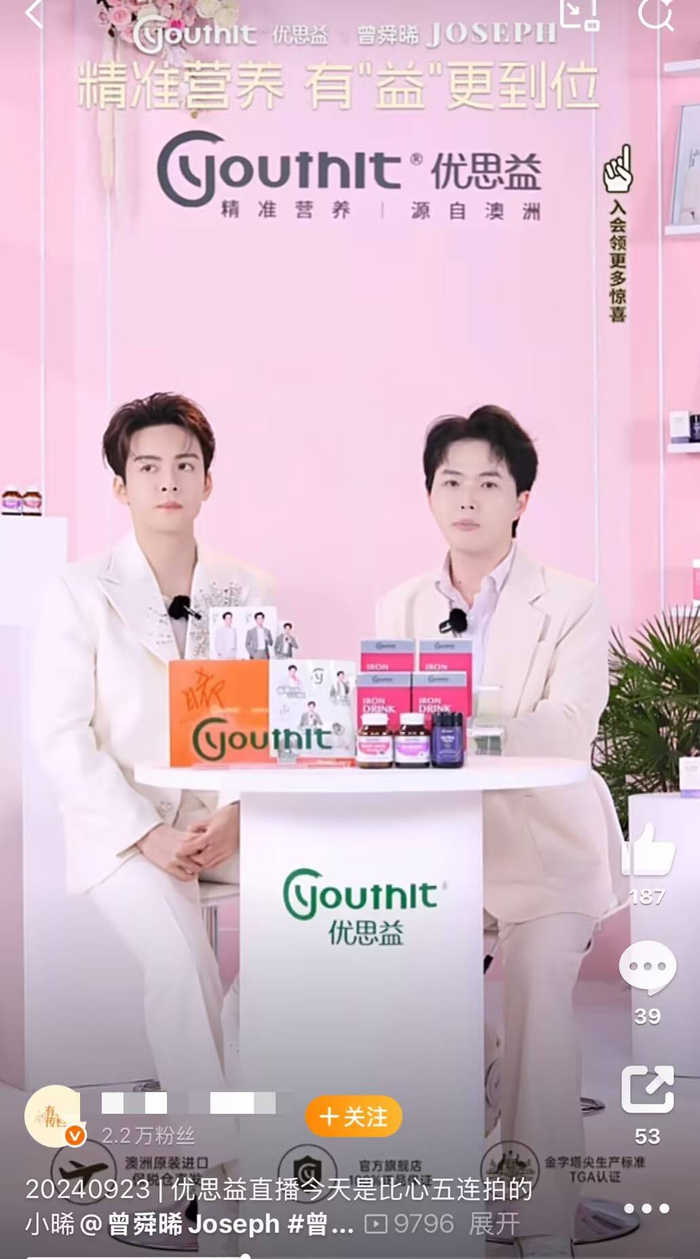 极目新闻记者注意到,明道、伊能静、章小蕙等直播间曾推广优思益产品,而演员曾舜晞2024年曾为优思益代言,更在当年6月、9月,数次出席了该产品的直播活动。