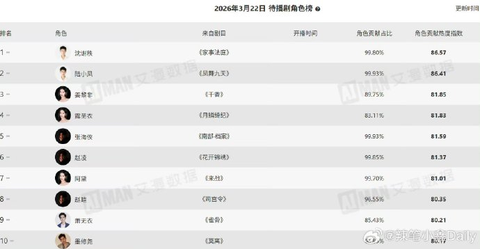 龚俊目前待播角色包括古装武侠剧《凤舞九天》中的陆小凤,该角色在待播剧榜单中热度仅次于《家事法庭》的沈谢秩,显示其古装题材的延续性。
