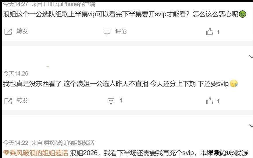 家人们,你们见过这么离谱的操作吗?一个号称“国民级”的综艺,能在短短一周之内,连续两次在开播前临时取消直播,把成千上万充了VIP会员的观众当猴耍!《乘风2026》,也就是咱们说的《浪姐7》,这次可真是玩脱了,直接把自己玩上了热搜,评论区清一色的“退钱”刷屏,场面那叫一个壮观。