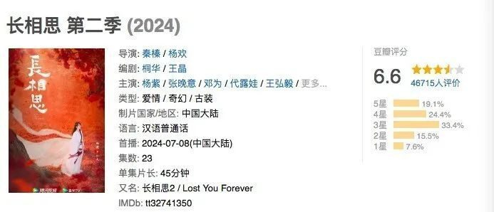 豆瓣上,相比《长相思》超41万人打出的7.8分,《长相思2》在近日开分后只有6.6分。