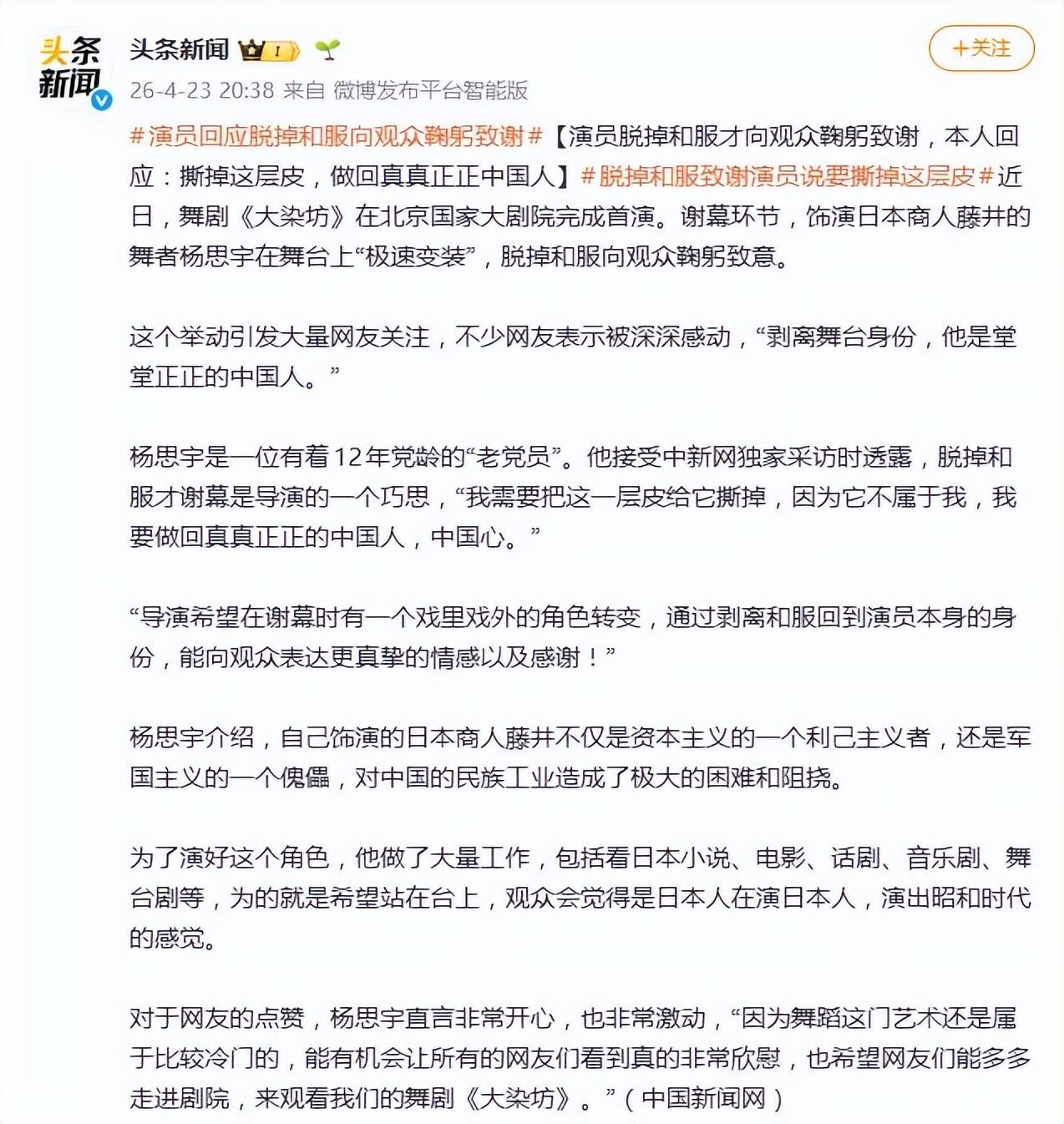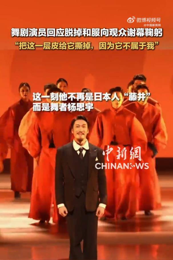 面对突如其来的全网关注,杨思宇本人也很快作出了回应。他在接受中新网独家采访时透露,这个“脱和服谢幕”的巧思其实来自导演。“我需要把这一层皮给它撕掉,因为它不属于我,我要做回真真正正的中国人,中国心。”杨思宇解释道,导演希望在谢幕时完成一个从戏里到戏外的身份转变,通过剥离和服回到演员本身,向观众表达更真挚的情感与感谢。
