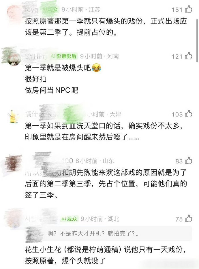 消息曝光后,舆论呈现明显两极。超八成书粉认可胡先煦的造型与角色适配度,话题 # 胡先煦十日终焉狼尾发型 #*单日阅读量破亿,不少观众称赞剧组尊重原著节奏,没有随意魔改加戏。与此同时,不少网友也玩梗调侃,称其 “落地成盒”“史上最快杀青主演”,戏称是专程进组拍摄 “爆头名场面”。