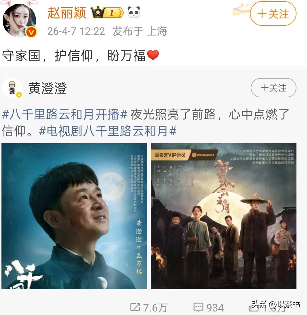 剧集播出后,演员赵丽颖第一时间在微博为他打call,一句“守家国,护心仰,盼万福”,瞬间冲上热搜。