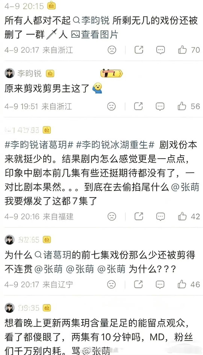 冰湖重生前五集戏份拉表:黄杨钿甜>张康乐>李昀锐 ……张萌说冰湖重生考虑过给黄杨钿甜的角色换演员、换脸等…李昀锐天选古人,张康乐基本功非常扎实。话说 李昀锐戏份这么少吗?戏份时长拉表,粉丝在向张萌维权!瓜主都出来为李昀锐说话了,同时放了影视瓜剑阁闻铃