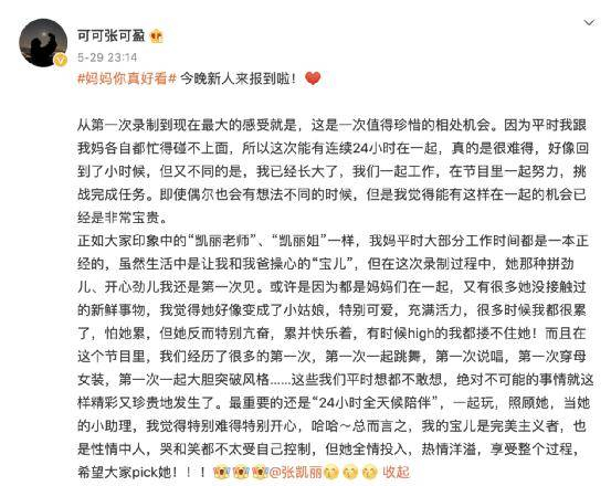 在上一期《妈妈,你真好看》节目中,张可盈叫妈妈是“我的宝”,很多人好奇张可盈为什么这么称呼妈妈。她本人表示,其实自己不也知道为什么,可能是因为觉得在生活中妈妈有很多地方像宝宝一样。并向大家透露妈妈张凯丽的不同面,一面是特别细心,另外一面是大条,有时候走路还会不小心摔倒,很让自己担心。“但实际上,她对我的事情上面,会想得非常周到”张可盈说。