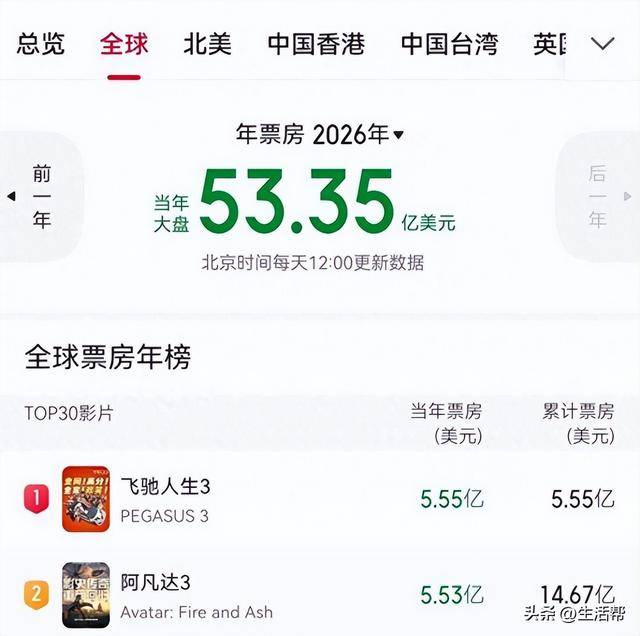 猫眼专业版数据显示,3月3日,沈腾、尹正等主演电影《飞驰人生3》2026年票房突破5.55亿美元,超越《阿凡达3》(5.53亿美元),暂列全球票房年榜第一。
