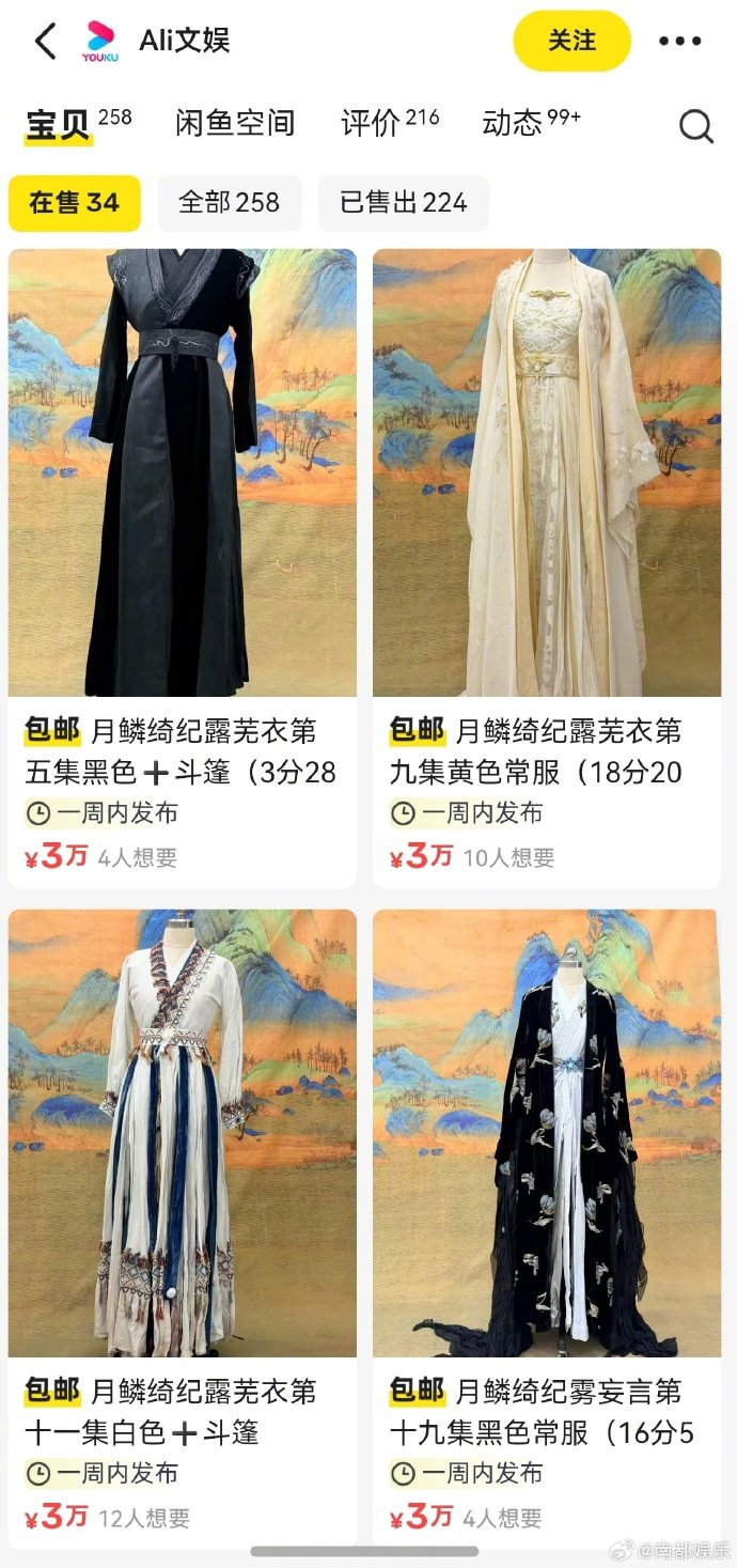 据4月21日报道,最近,有网友发现优酷官方在某二手平台上“悄悄”干起了副业——直接售卖热播剧《月鳞绮纪》中的原版戏服。主角鞠婧祎饰演的“露芜衣”和陈都灵饰演的“雾妄言”的剧中造型赫然在列,每件定价清一色3万元。这波操作迅速引发围观,而更让人惊讶的是,目前已有六套显示“售罄”,粉丝的购买力可谓相当直接。