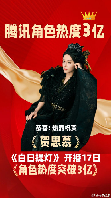 迪丽热巴在奇幻剧《白日提灯》中饰演的鬼王"贺思慕"于2026年4月13日腾讯视频站内角色热度突破3亿,成为平台年度剧集角色热度总榜TOP1,刷新了腾讯视频历史纪录。