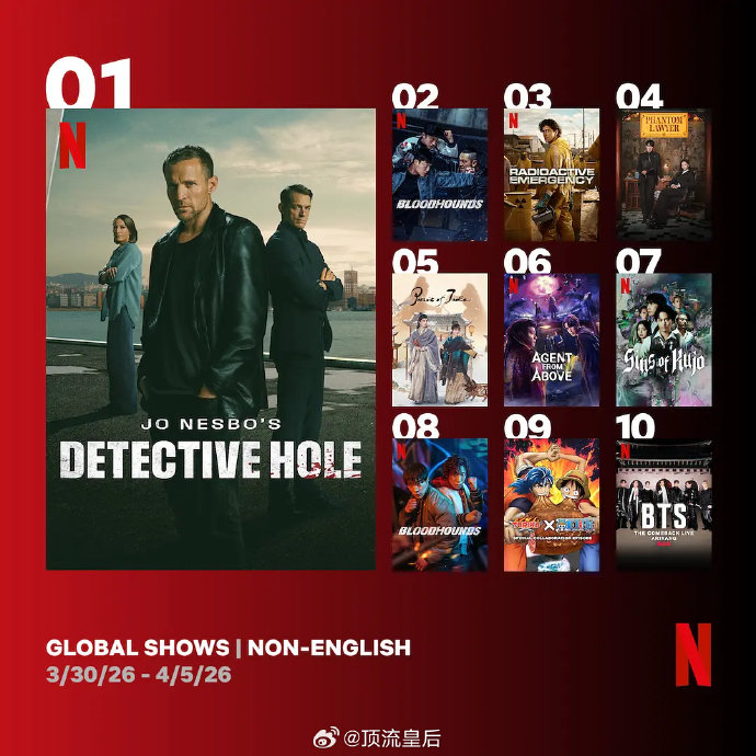 韩国:在韩网飞总榜最高升至第2位,打破韩剧常年垄断格局。其含金量源于网飞韩区采用“有效观看人次”统计标准,播放量接近同期热播韩剧水平,并引发Naver开放论坛单帖4.6万人参与的讨论热潮。