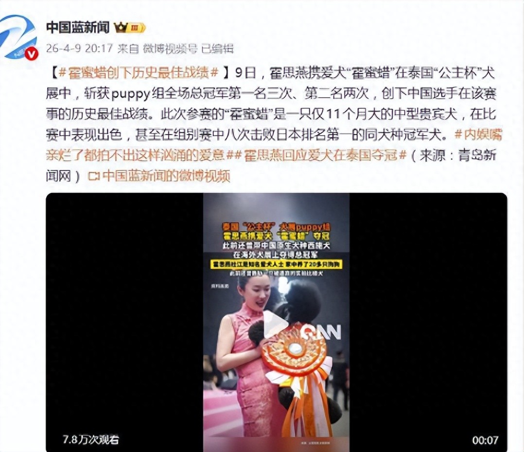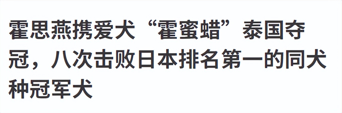 外媒:霍思燕携爱犬“霍蜜蜡”泰国夺冠,八次击败日本排名第一的同犬种冠军犬