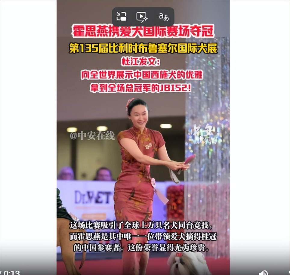 中安在线2025-12-22霍思燕着旗袍牵西施犬拿下国际犬展冠军