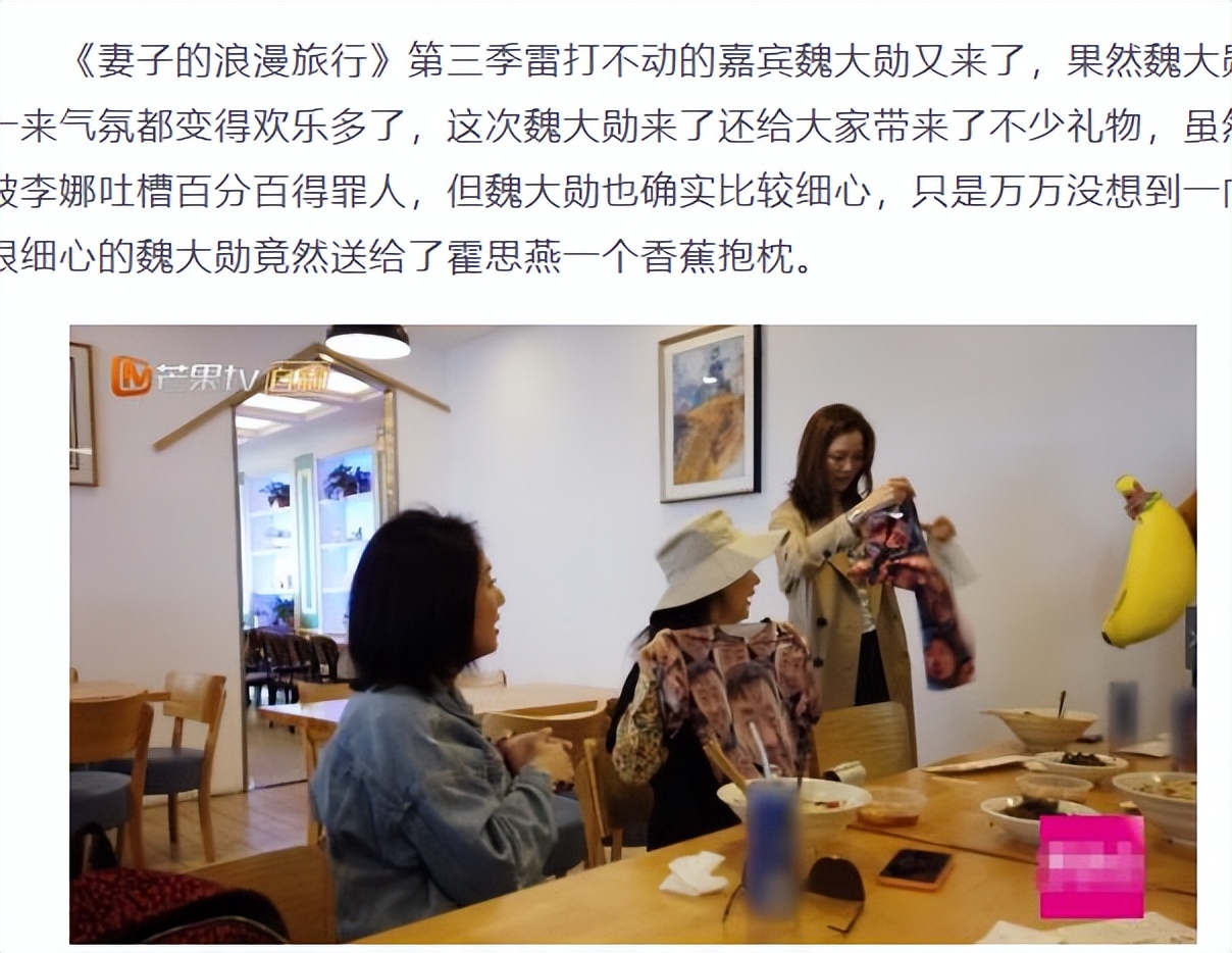 在《妻子的浪漫旅行》里,魏大勋送了一个巨型香蕉抱枕给霍思燕,她看到后瞬间脸色发白,整个人往后退。