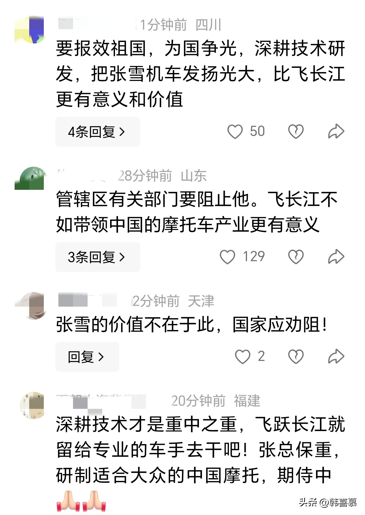 ,1. 张雪飞跃长江,这操作更像是在挑战命运啊,和他平时造车的风格一样,都是直冲到底! ,2. 张雪飞跃长江成功率高,但我觉得他成功的秘密可能就是他平时造车的耐心,技术没问题。 ,3. 人都有缺点,张雪的张狂反而让人觉得他是真大哥风范,支持他,毕竟他敢做敢为。 ,4. 张雪飞跃长江考察了很多因素,现场条件也很完善,感觉他这次一定要成功,毕竟经验丰富。 ,5. 飞跃长江真的很危险,张雪是不是少考虑了些什么?不过支持他,继续往前冲,毕竟他已经造出了冠军车。 ,6. 交警称张雪机车是打鸡血,这比喻挺有趣的,张雪也硬刚地回应,挺有大佬风范。 ,7. 张雪的成功经历证明,坚持和努力真的很重要,飞跃长江也是在继续他的传奇。 ,8. 大家都认可张雪的造车技术,飞跃长江也是对自己技术的认可,继续加油! ,9. 张雪的冲动有时候会让人头疼,但这也是他独特的个性,支持他,毕竟他敢闯敢试。 ,10. 人无完人,张雪也不例外,但支持他飞跃长江,毕竟他用自己的方式展示了中国的创新精神。