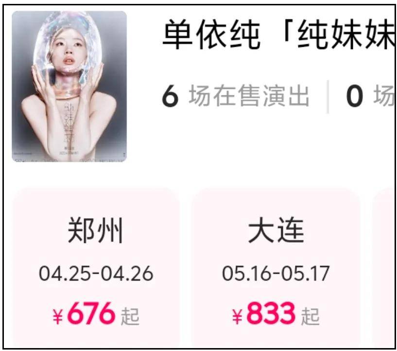 不止一位网友发现,单依纯最新一场郑州演唱会的票价“腰斩”了,在二级市场,也就是所谓黄牛票,每个价位都打折了,很大一部分打五折都卖不出去,甚至跌到了五折以下。