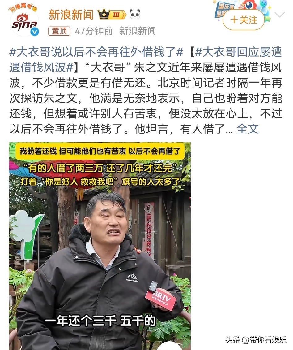 1. **吃瓜小师傅**:大衣哥借出去的8万,还回来不到2万,这波操作,简直是“吃瓜”界的新标杆! ,2. **无聊猫**:这波操作,大衣哥直接把“吃瓜”做成了“喝汤”! ,3. **社交达人**:有钱人的烦恼,原来就是借钱还不还啊,哈哈哈! ,4. **孤岛主**:大衣哥这波操作,直接把“吃瓜”升级成了“吃苦头”! ,5. **网红农民**:借出去的钱,还不到一半,直接把“吃瓜”变成了“喝苦水”! ,6. **深夜食客**:大衣哥这波操作,简直是“吃瓜”界的“大剧院”! ,7. **小酒窖**:借钱不还,还好意思说自己有钱,真是个“吃瓜高手”! ,8. **深夜打工人**:这波操作,大衣哥直接把“吃瓜”变成了“喝茶”! ,9. **低调侦探**:借出去的钱,还不到一半,直接把“吃瓜”变成了“吃苦头”! ,10. **吃瓜老板**:大衣哥这波操作,简直是“吃瓜”界的“大戏场”!1. **借钱高手**:大衣哥借了8万,回来才2万,这也太少了吧,听说他最近在短视频里说"我没钱",看来是真没啦!, ,2. **还款小白**:8万借出去,2万还回来,这还差那么多?这也太惨了吧,难怪他放下话筒了,气死了吧。, ,3. **朱之文的善良**:大衣哥借了8万,朱之文当初还给他堂弟修路的那16万都没刻名,真是个大善良啊,而大衣哥的还款也太少了。, ,4. **还款差距**:8万借出去,2万还回来,差了96%!这也太不够了吧,听说他还在村里帮人修路,真是个大好人啊。, ,5. **短视频爆款**:他短视频里的"没钱"可真给大家看了,热搜上炸了,借钱的都在收拾东西了,估计大衣哥也得收拾收拾了。, ,6. **朱之文的谦虚**:大衣哥借了8万,回来2万,朱之文还是回了个"谢谢",这才是真正的谦虚,真是个大好人啊。, ,7. **借钱比感情**:8万借出去,2万还回来,就像感情里的相思,多么少啊,听说他还在村里帮人办孝宴,真是个大好人。, ,8. **名气和善良**:他短视频火了,名气也挺大,但还款才2万,真是个大善良啊,听说他还在村里帮人修路,真是个大好人。, ,9. **借钱和还款**:8万借出去,2万还回来,这还差那么多,听说他还在村里帮人办孝宴,真是个大好人啊。, ,10. **还款和媒体热议**:借钱还不够,还差那么多,听说他短视频里的"没钱"火了,真是个大好人啊,估计大衣哥也得收拾收拾了。