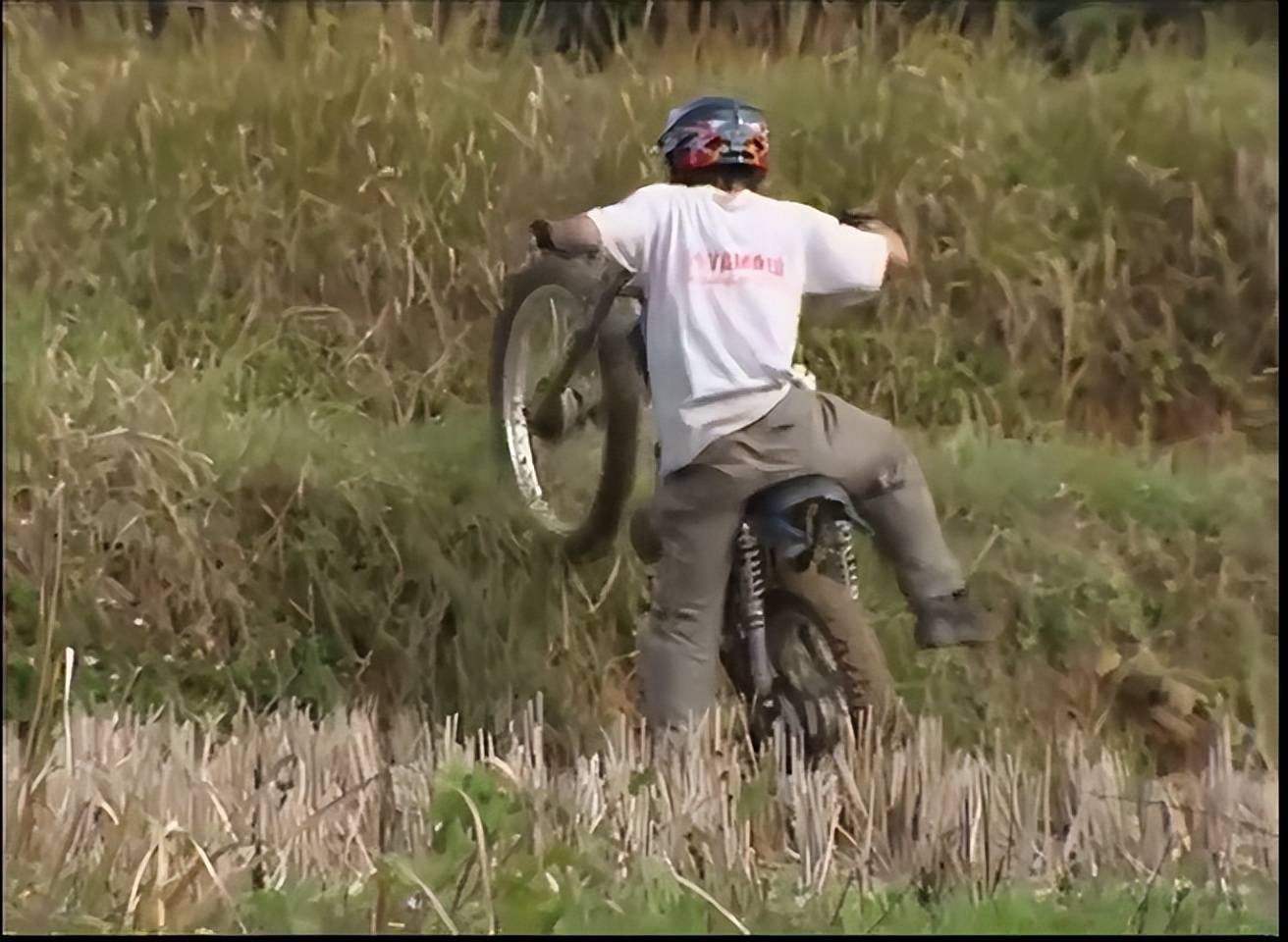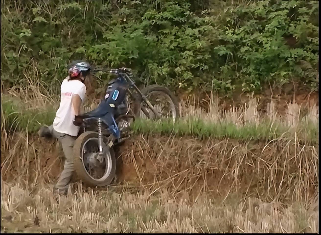 但张雪一再请求只需要给他10分钟来证明自己,摄制组最终还是答应跟着他去到田间完成拍摄。结果开局不顺,由于摩托车胎的抓地力不够,摩托车卡在田埂上冲不上去。