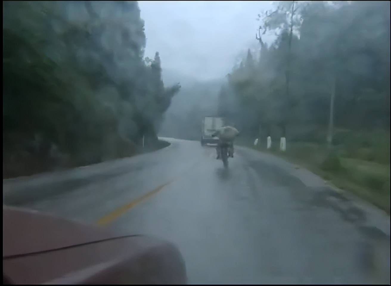 当车翻越大山时,山顶起了大雾,不一会又下起了小雨,气温骤降到只有十来度。为了避开迎面打来的雨水,张雪把整个身体都偏向了一边,脸也被冻得通红,但他却丝毫没有想要退缩的意思,眼里依然闪着坚定的光。