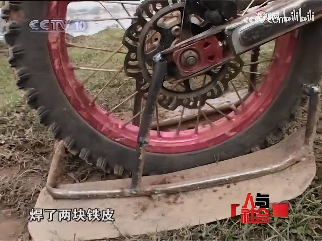 张雪的摩托车的改装非常有创意,他在车轮上焊接了两块铁皮作为漂行时的滑水板。
