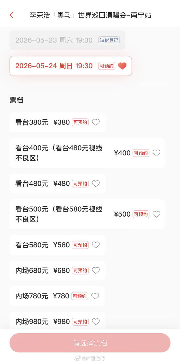 #李荣浩南宁演唱会连唱两晚#【演出场次加码!李荣浩《黑马》世界巡回演唱会-南宁站,连唱两晚】4月13日,南宁良庆区文广体旅局在广西南宁市良庆区人民政府官网上发布【(变更)良庆区营业性演出准予许可决定李荣浩《黑马》世界巡回演唱会-南宁站】消息,内容显示李荣浩《黑马》世界巡回演唱会-南宁站本地演出日期调,整为2026年5月23日至2026年5月24日,演出场次为2场。