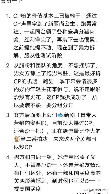 一个是CP粉的价值基本上已经被榨干,通过CP声量拿到了新丽的《尚公主》、跑男常驻,一起同台领了各种盛典分猪肉,红利拿完了,再装下去也很累,现在到了暴力拆解、服从性测试的阶段。