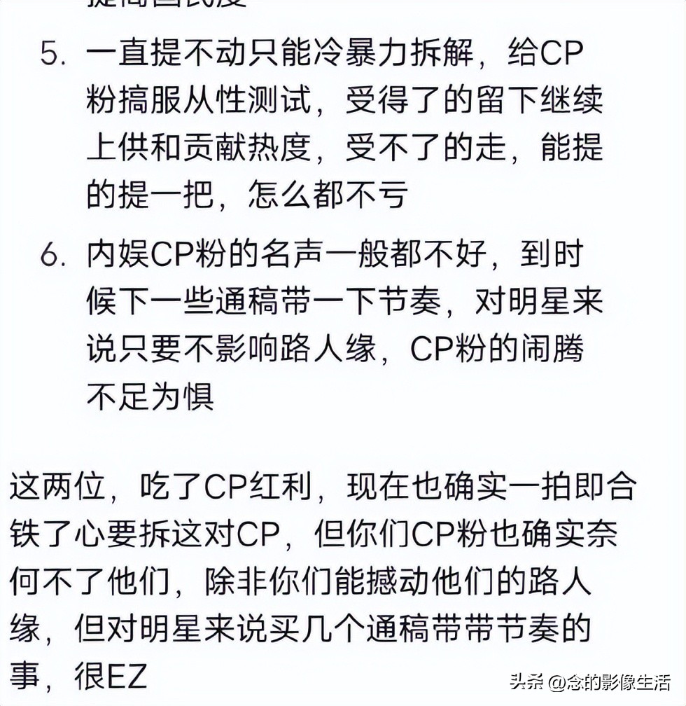 总结一句话就是,吃完了CP粉的红利,也要考虑未来的路,因为毕竟两个人都还要合作其他的男、女演员,不可能这辈子就绑死了彼此。
