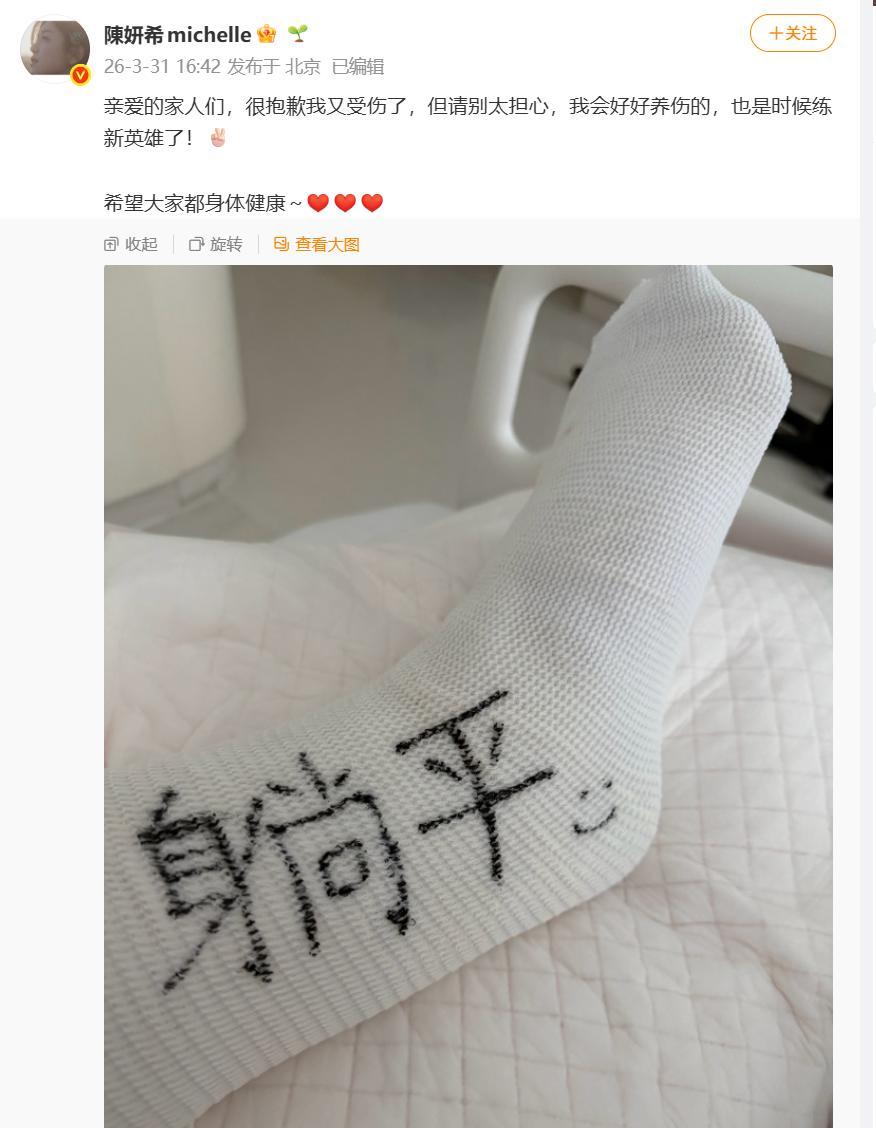 3月31日,陈妍希工作室发文确认,一个让不少粉丝揪心的消息来了,陈妍希在前一天做运动训练时发生意外,跟腱断裂,已经完成手术,接下来要进入一段时间的静养和康复。