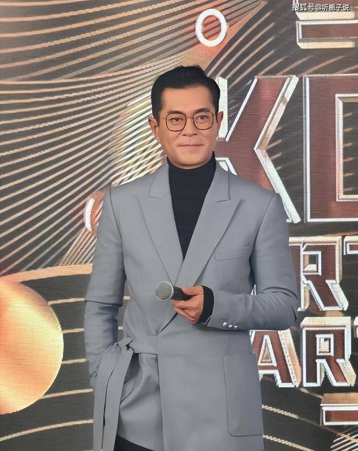 古天乐穿了一件黑色的高领内搭,浅灰色的西装外套,搭配黑色的裤子,又修身又减龄,不管是容颜还是身材,他保持的都很好。