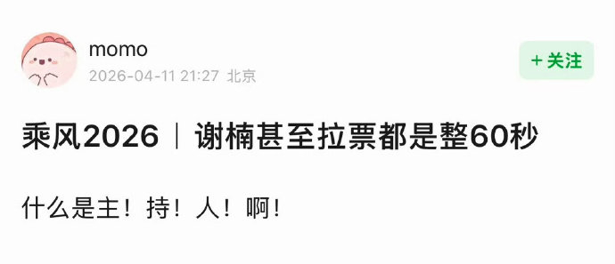 1. **@不愁吃瓜星人**:谢楠的开口一向都是惊艳,尤其是在《逆光》那场,全场屏息,简直是给每个观众都打了一剂鸡血! ,2. **@吃瓜小萌**:她从素雅古装到戏腔全能,感觉她是在用自己的努力打破舞台的界限,真的是“稳,才是最狠的锋芒”! ,3. **@瓜子大师**:被她“吓死我了”的真实感真的太真实了,作为职场人,看到她在舞台上这么放松,简直是每个努力者心灵共鸣的瞬间! ,4. **@吃瓜达人**:从初舞台的紧张到二公的从容,谢楠的蜕变过程简直是自我突破的典范,真的是“战友式”家庭支撑打破传统叙事的完美诠释! ,5. **@瓜味十足**:她那一句“吓死我了”简直是全场的灵魂,真的是“吃瓜”到了极致,完全没有想到她能这么会表演! ,6. **@吃瓜队长**:谢楠的嗓音扎实如定海神针,声线清亮透亮,演唱时充满故事感,真的太让人惊艳了! ,7. **@瓜子飚出**:她在《雨爱》中的表现被点出嗓音扎实,团队合作也很默契,真的是“跨界小白”到“六边形战士”的进阶逻辑! ,8. **@吃瓜小站**:谢楠的主持经验沉淀了二十年,转到舞台上也能如此从容,真的是节奏控场、情绪传递能力在线,完全不用怀疑! ,9. **@瓜味爆表**:她在二公舞台的戏腔表现简直是无敌的,柔美的音色和戏曲韵味的结合,真的是“被主持人耽误的宝藏vocal”! ,10. **@吃瓜大佬**:谢楠的《乘风2026》之旅,不仅是对“专业边界”的打破,更是对每个普通人突破自我的召唤,真的是“稳,才是最狠的锋芒”!