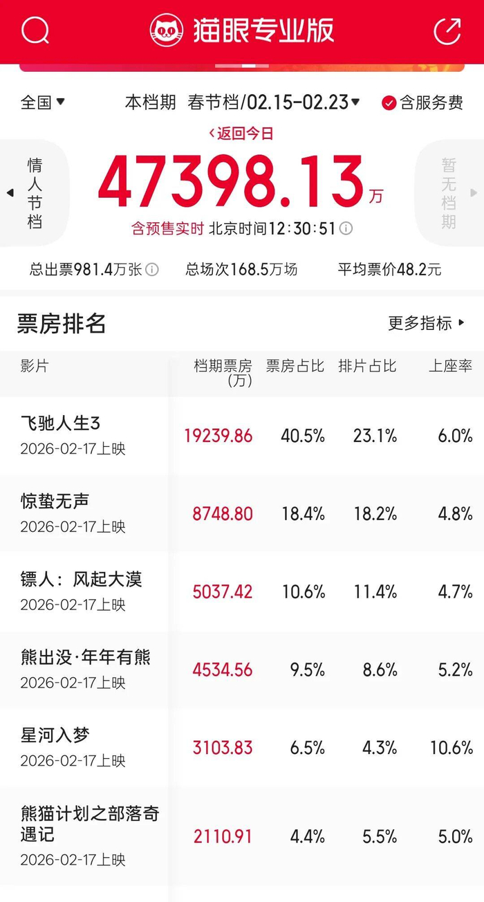截至2月16日12点30分,根据猫眼专业版实时数据统计预估,春节档总票房(含预售及点映)经过近一周爬坡来到4.7亿元,共计出票超过983万张、总场次超过168.6万场。
