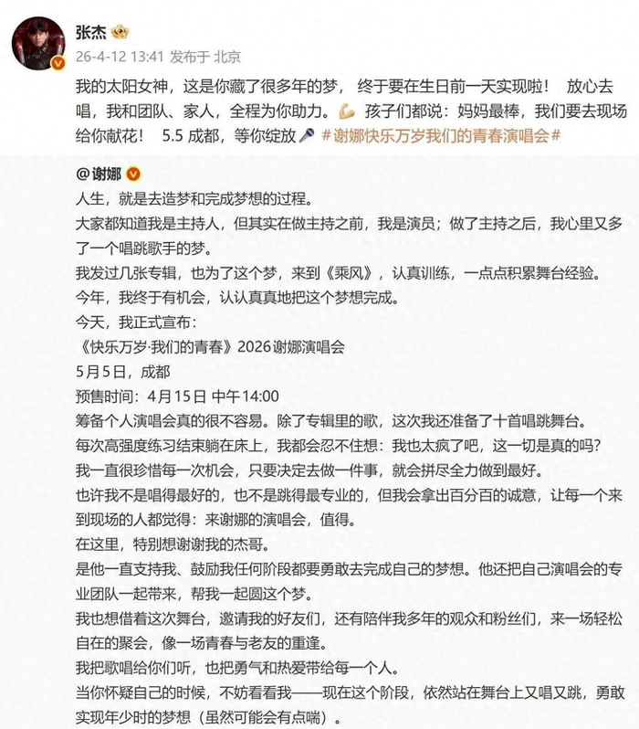 谢娜这边也有甜蜜互动,她转发张杰微博致谢,还透露会参与张杰4月16日鸟巢演唱会的“小火车巡游互动环节”,幽默喊话“记得给我留位置”。 这波双向奔赴,又被网友称为“爱情样本”。