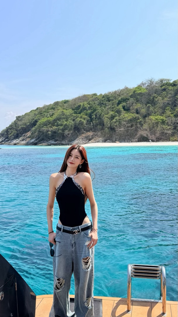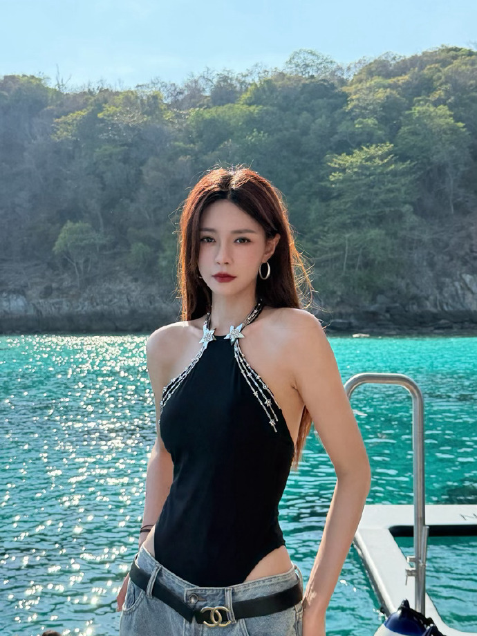 画面中的她穿着黑色挂脖泳装以银钻镶边勾勒肩颈线条,搭配低腰牛仔裤,既展露了常年自律的优越身材,又用牛仔单品平衡了性感与飒爽。镜头里的她,或是倚在泳池边侧头微笑,或是在游艇上舒展手臂,墨镜与低马尾的搭配,让妆容在清透中多了几分酷感。从和杜海涛恋爱初期被贴上 “不被看好” 的标签,到如今领证后的安稳,她的这份舒展,恰是被爱滋养后的底气。
