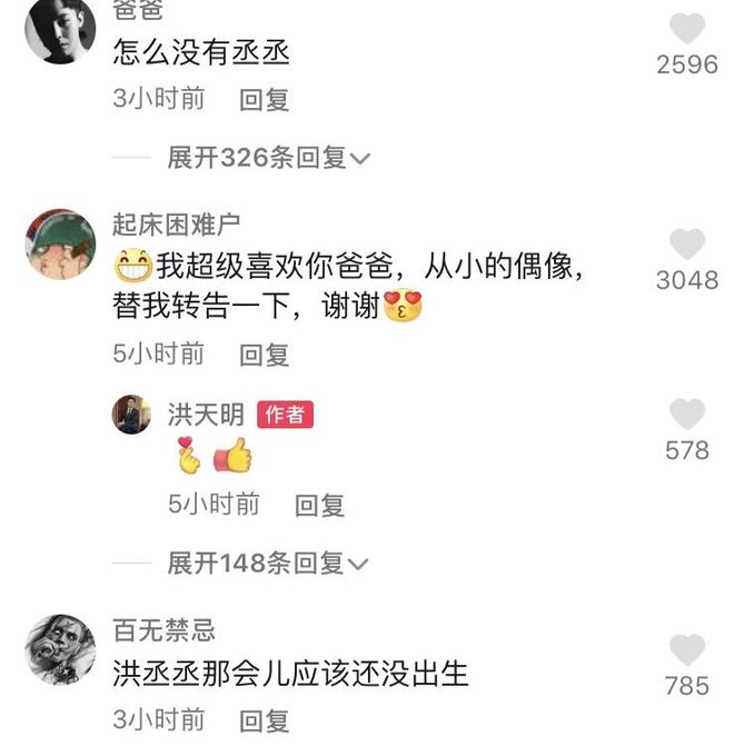 网友留言:怎么没有丞丞?洪丞丞那会儿应该还没有出生。对于这一些恶意的评论,洪天明没有删除掉,反而是视而不见。另外有粉丝说自己超级喜欢你爸爸,替我转告一下,对于这一种正能量的评价,洪天明表示出了回应。
