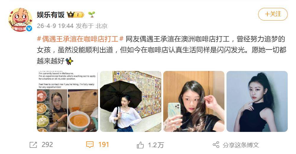 1. **“舞台上是霓虹,咖啡店是星光”** , 王承渲从偶像到咖啡店打工,仿佛从一个星球转到了另一个星球,谁能说她不精彩?,2. **“经纪公司暂停演艺工作,直接安排咖啡店打工,真是太贴心了”** , TPG文创娱乐的温柔乡,原来就是咖啡店。,3. **“这波操作,堪比隐退后的林宥嘉”** , 从选秀出道失败到平静生活,王承渲的选择,和林宥嘉一样,选择了自己想要的生活方式。,4. **“不做明星,反而更自由自在”** , 有人说“不做明星更容易活”,看来王承渲就是这么想的,咖啡店的生活,注定是她的自由天堂。,5. **“从冰淇淋到咖啡,王承渲的打工历程,堪比一部励志电影”** , 卖冰淇淋、做咖啡,打工者恒久远,王承渲的打工魂,值得一部电影化。,6. **“娱乐圈的“浪费”,原来是这么浪费”** , 再糊都有短剧拍,而她在咖啡店打工,真是“人才浪费”大师级。,7. **“平静自在的咖啡店生活,配上围裙,简直是另一种“闪闪发光””** , 围裙、咖啡、平静,王承渲的生活,原来可以这么好看。,8. **“从舞台到咖啡台,成功的另一种定义”** , 舞台上的聚光灯,咖啡店里的香气,成功从来不是只有一种模样。,9. **“王承渲的努力,配上咖啡店,真的太感人了”** , 她用双手做咖啡,靠双手改变命运,打工者难得有如此励志的故事。,10. **“愿王承渲的咖啡店生活,永远保持这种平静与幸福”** , 平静的咖啡店生活,配上她的努力,简直是人生的完美画面。1. **吃瓜评论1**: ,“原来偶像也是会打工的哈哈哈,王承渲姐的咖啡技艺比我还强,看来不做明星也能活得很开心!”,2. **吃瓜评论2**: ,“从选秀出道没成功,现在在咖啡店打工,感觉她的人生还挺有节奏的,羡慕她的平静!”,3. **吃瓜评论3**: ,“曾经追星的我,竟然没想到这位选手后来会变成咖啡店的速成小白,真是人生无奇不惊喜!”,4. **吃瓜评论4**: ,“娱乐圈太难做,转头去做咖啡店打工更靠谱,愿她每天都能享受工作的快乐!”,5. **吃瓜评论5**: ,“从选秀选手到咖啡店打工,王承渲的逆袭之路真是太有趣了,原来不做明星也能闪闪发光!”,6. **吃瓜评论6**: ,“这姐姐从B班逆袭到A班,结果还是没能出道,好在她找到了自己喜欢的事情,生活才更自在!”,7. **吃瓜评论7**: ,“娱乐圈的光环虽然璀璨,但咖啡店的生活更靠谱,王承渲姐的选择值得我们尊重!”,8. **吃瓜评论8**: ,“从选秀选手到咖啡店打工,王承渲姐的人生轨迹真的是让人哭笑不得,愿她每天都开心!”,9. **吃瓜评论9**: ,“曾经的偶像光环褪去,咖啡店的生活却让她找回了平静,真心为她点赞!”,10. **吃瓜评论10**: ,“娱乐圈的霓虹灯虽然亮,但咖啡店的生活更温暖,王承渲姐的选择实在太靠谱了!”