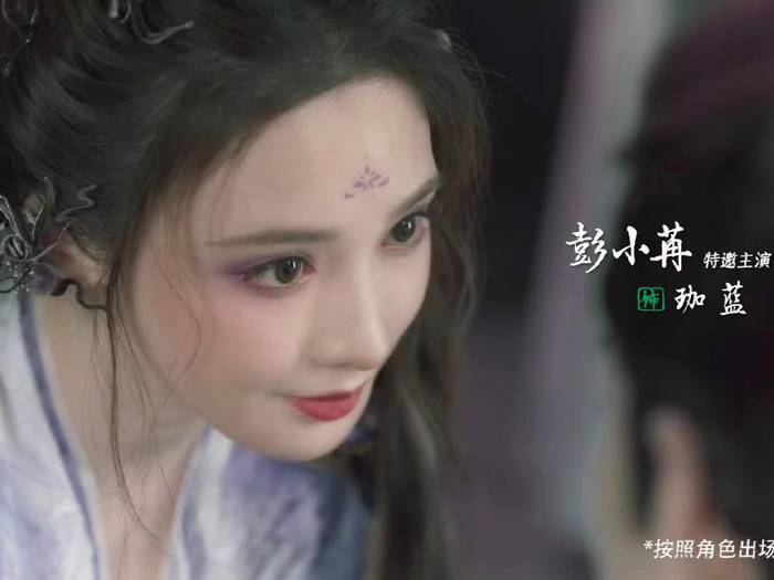 彭小冉扮演迦蓝,白紫色长裙和紫色眼妆很惹眼,这简直是《东宫》后最好看的装扮了,彭小冉就适合这样明艳的妆容。