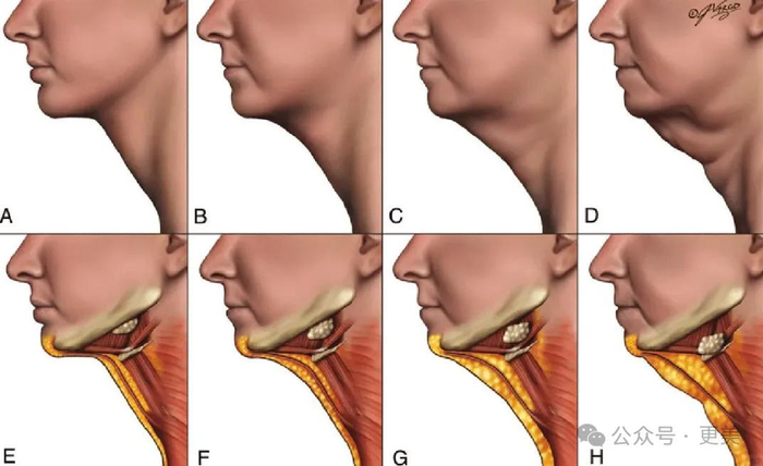 当衰老来临,韧带和肌肉的拉力衰退,软组织各层次贴合性变差,脂肪室受到的约束力减弱,就会出现膨出,进而导致下颌缘模糊。